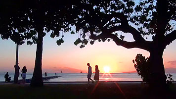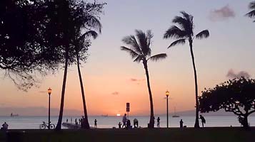 Silhouettes of people passing by and the setting sun in Kapiolani Park.